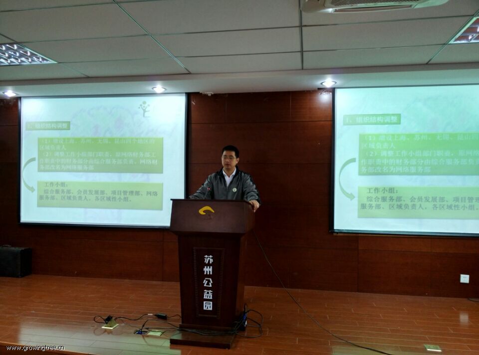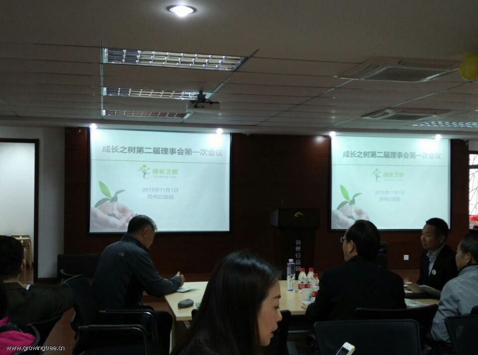 2015年11月1日成长之树第二届理事会第一次会议在苏州公益园成功召开。会上邀请到了苏州大学文哲研究所副研究员、苏州市唐文治国研究会秘书长、虎丘书院执行院长陈东兴教授致词。陈教授对成长之树第一届理事会换届和第二届理事会顺利召开,与举办5周年庆典表示热烈的祝贺。