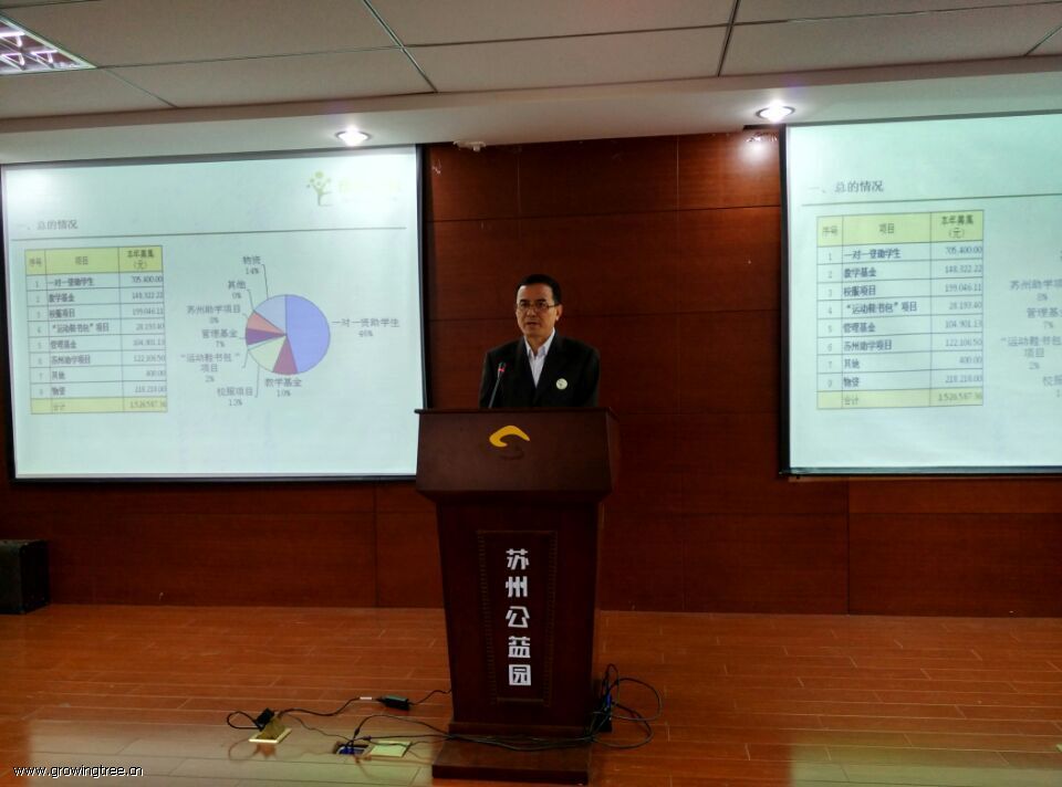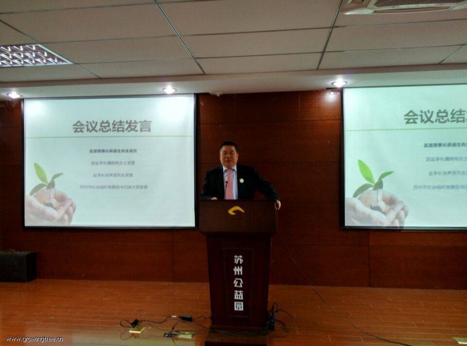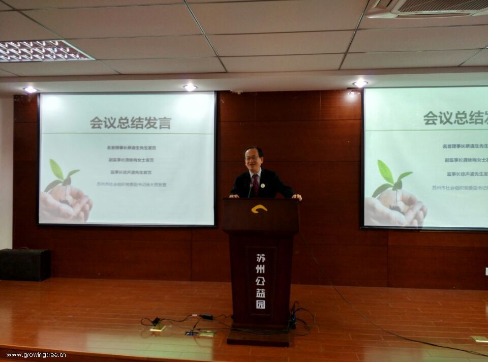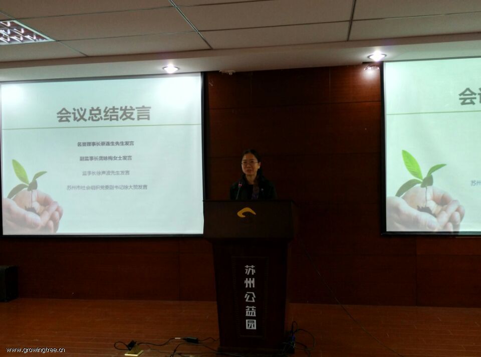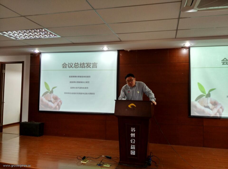 名誉理事长蔡连生先生、副监事长龚咏梅女士、监事长徐声波先生以及苏州市社会组织党委副书记徐大赞先生对大会作了总结发言。大家对成长之树都给予了高度的评价和肯定,非常赞同成长之树这种将爱传递的方式,徐书记对成长之树在未来得发展过程中提出了宝贵的建议,①注重坚定使命,②团队建设,危机的处理和应对,③更要注意成效,将有限的公益资源做得最大。